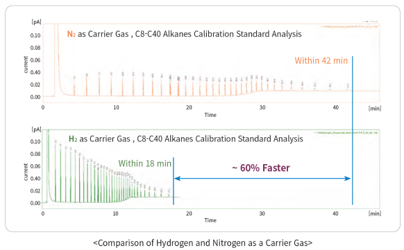 • 50~70% decrease in the average analysis time with H2 as a carrier gas!