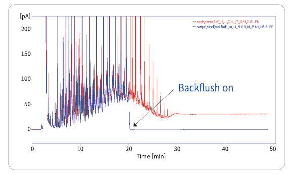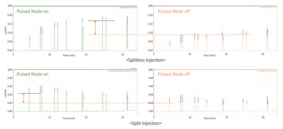 • In the pulsed pressure mode, ChroZen GC instantly increases forefront pressure at injection to avoid the sample dispersion and minimizes backflash exceeding the liner volume as well as carry-over to provide significant sensitivity.